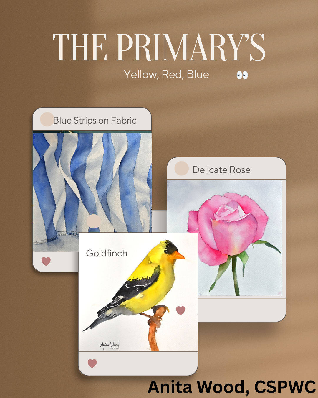 This bundle includes Watercolor for Beginners, Starting Off Right, and three videos of Painting the Primary Colors, Yellow, Goldfinch, Red, Delicate Rose, Blue, Blue Stripes on Fabric