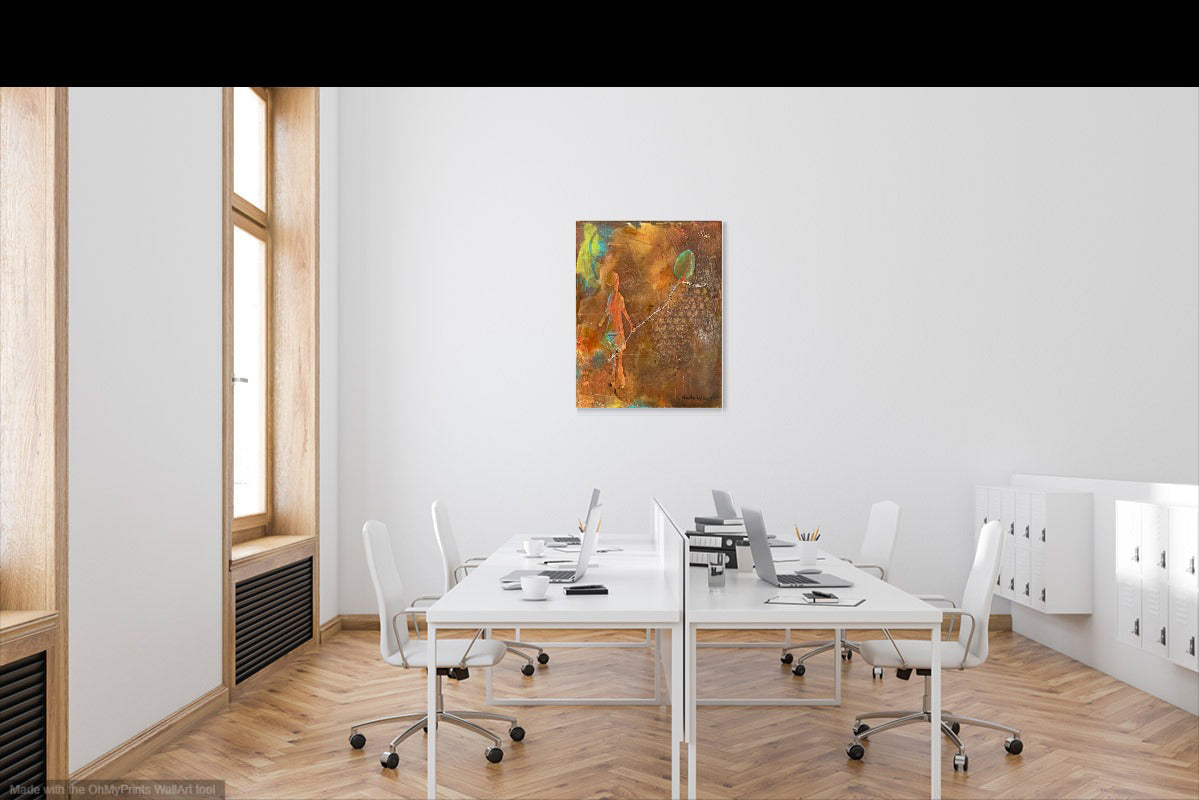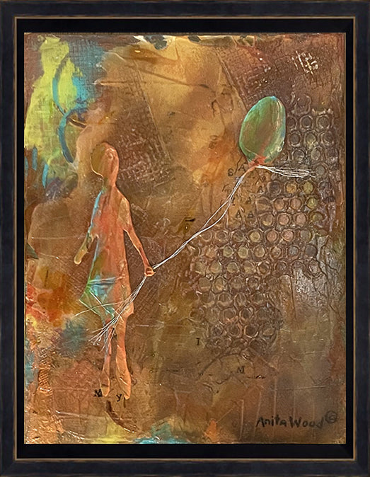 This painting has many layers with many mediums and fluid acrylic paints, plus gold thread for the string of the balloon. The finish is a mixture of mat and gloss as the figure in the painting is mat in comparison the the gloss of the rest of the painting.