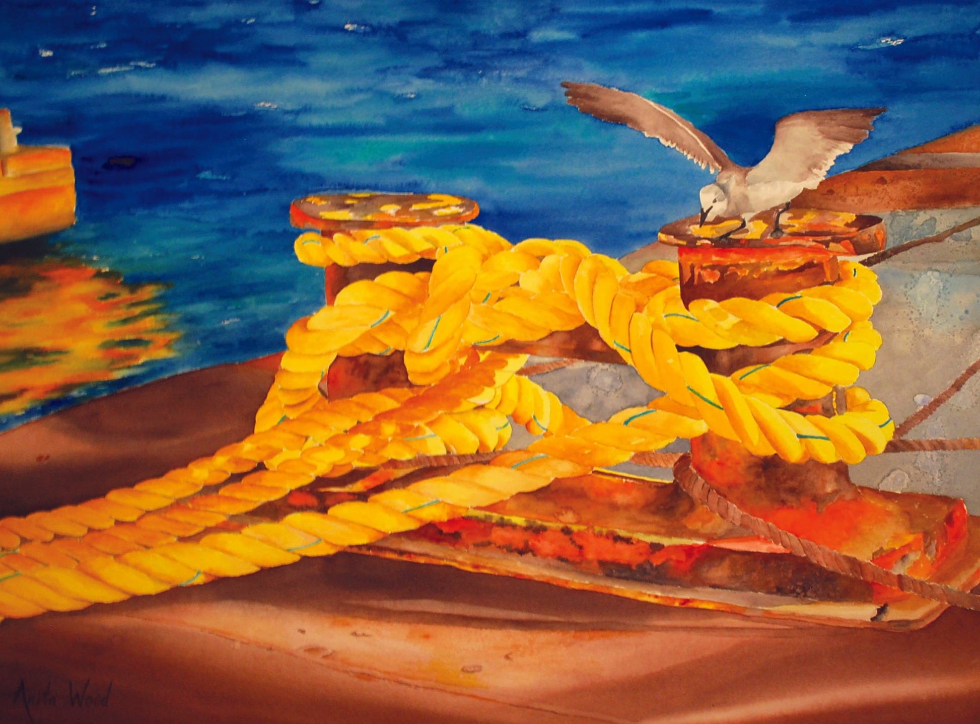 A vibrant, nautical watercolor capturing the energy of the waterfront — glowing ropes, sunlit rust, and the single determined bird that brings the entire scene to life. A dynamic, joyful piece celebrating color, texture, and the spirit of coastal places.